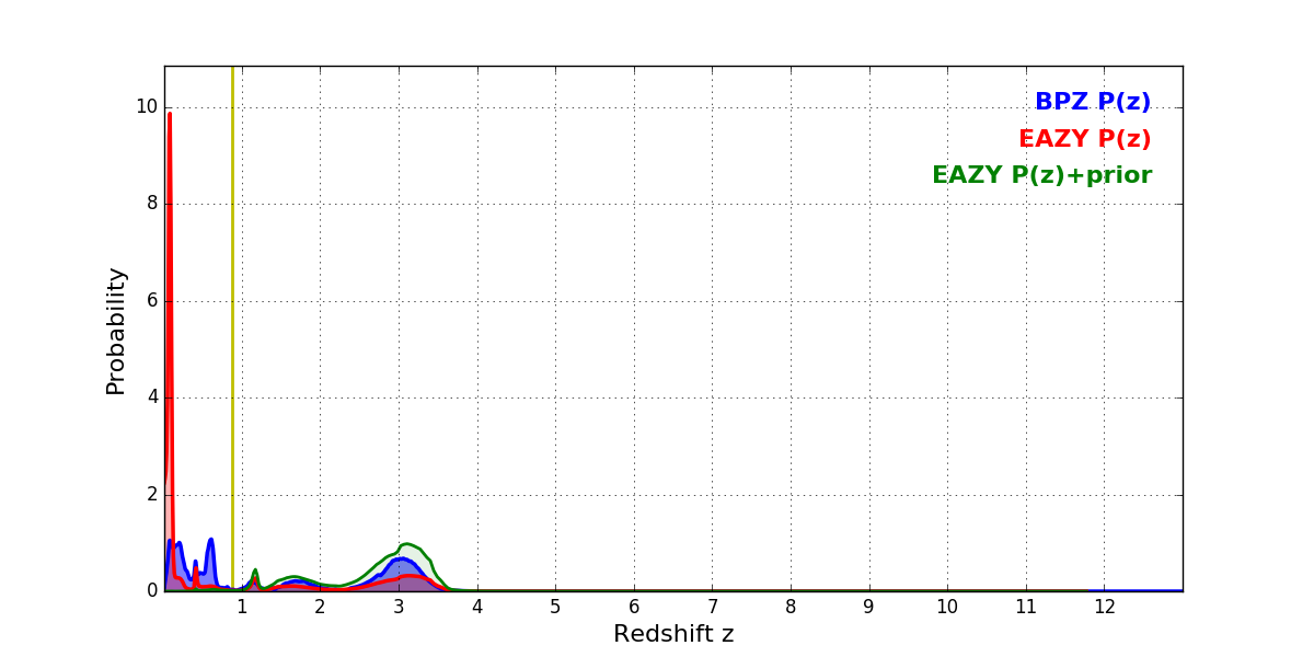 In P(z) plots: Yellow lines mark the cluster redshift z = 0.870,