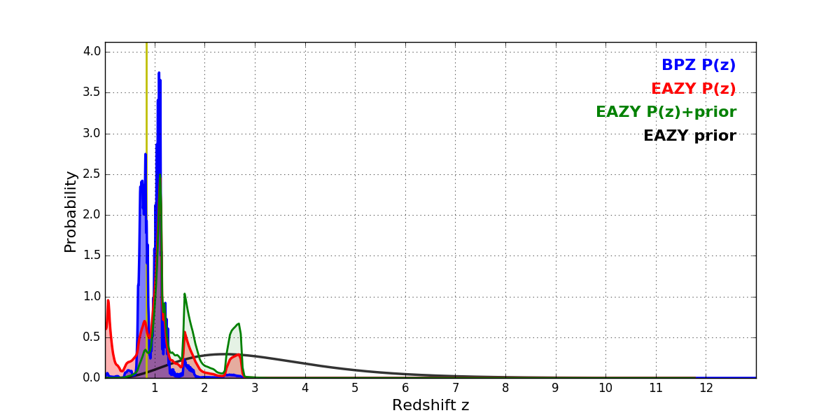 In P(z) plots: Yellow lines mark the cluster redshift z = 0.833,