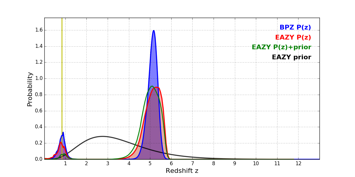 In P(z) plots: Yellow lines mark the cluster redshift z = 0.833,