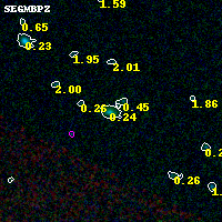 Object #1043 x,y = (2962, 3531) RA, Dec = (00:25:28.032, -12:21:52.56) = (6.36680, -12.36460) BPZ = 0.243 [0.200--3.610] type = 2.90 (Ell5_A_0 - Ell6_A_0) chisq2 = 0.00 ODDS = 0.24 z_cluster = 0.586