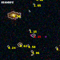 Object #2419 x,y = (3423, 2235) RA, Dec = (00:25:26.136, -12:23:10.32) = (6.35890, -12.38620) BPZ = 1.150 [0.143--3.616] type = 10.10 (SB3_B10 - SB11_A_0_l) chisq2 = 0.11 ODDS = 0.07 z_cluster = 0.586