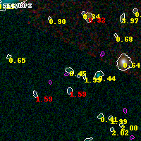 Object #2535 x,y = (1009, 2124) RA, Dec = (00:25:36.024, -12:23:16.80) = (6.40010, -12.38800) BPZ = 0.445 [0.110--3.728] type = 8.50 (SB2_B10 - SB1_B10) chisq2 = 0.00 ODDS = 0.06 z_cluster = 0.586