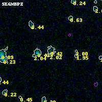 Object #254 x,y = (2470, 4100) RA, Dec = (00:25:30.048, -12:21:18.36) = (6.37520, -12.35510) BPZ = 0.425 [0.130--3.566] type = 8.90 (SB2_B10 - SB1_B10) chisq2 = 0.00 ODDS = 0.06 z_cluster = 0.586