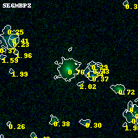Object #3768 x,y = (2609, 965) RA, Dec = (00:25:29.472, -12:24:26.64) = (6.37280, -12.40740) BPZ = 0.761 [0.638--1.021] type = 2.30 (Ell6_A_0 - Ell5_A_0) chisq2 = 0.00 ODDS = 0.71 z_cluster = 0.586