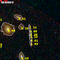 Object #192 x,y = (3545, 3098) RA, Dec = (00:25:25.632, -12:22:18.48) = (6.35680, -12.37180) BPZ = 1.798 [1.150--3.124] type = 10.40 (SB3_B10 - SB11_A_0_l) chisq2 = 0.13 ODDS = 0.16 z_cluster = 0.586