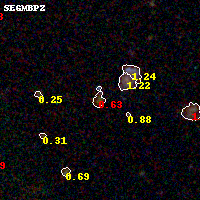 Object #34 x,y = (1967, 3573) RA, Dec = (00:25:32.112, -12:21:50.04) = (6.38380, -12.36390) BPZ = 0.632 [0.422--3.749] type = 8.60 (SB2_B10 - SB1_B10) chisq2 = 1.60 ODDS = 0.40 z_cluster = 0.586