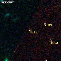 Object #6 x,y = (1814, 3873) RA, Dec = (00:25:32.736, -12:21:32.04) = (6.38640, -12.35890) BPZ = 1.124 [0.134--3.584] type = 9.50 (SB3_B10 - SB2_B10) chisq2 = 0.51 ODDS = 0.08 z_cluster = 0.586