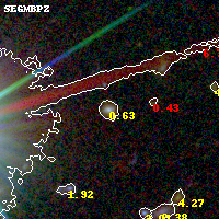Object #98 x,y = (2999, 3313) RA, Dec = (00:25:27.888, -12:22:05.52) = (6.36620, -12.36820) BPZ = 0.628 [0.530--3.599] type = 9.00 (SB2_B10) chisq2 = 0.18 ODDS = 0.78 z_cluster = 0.586