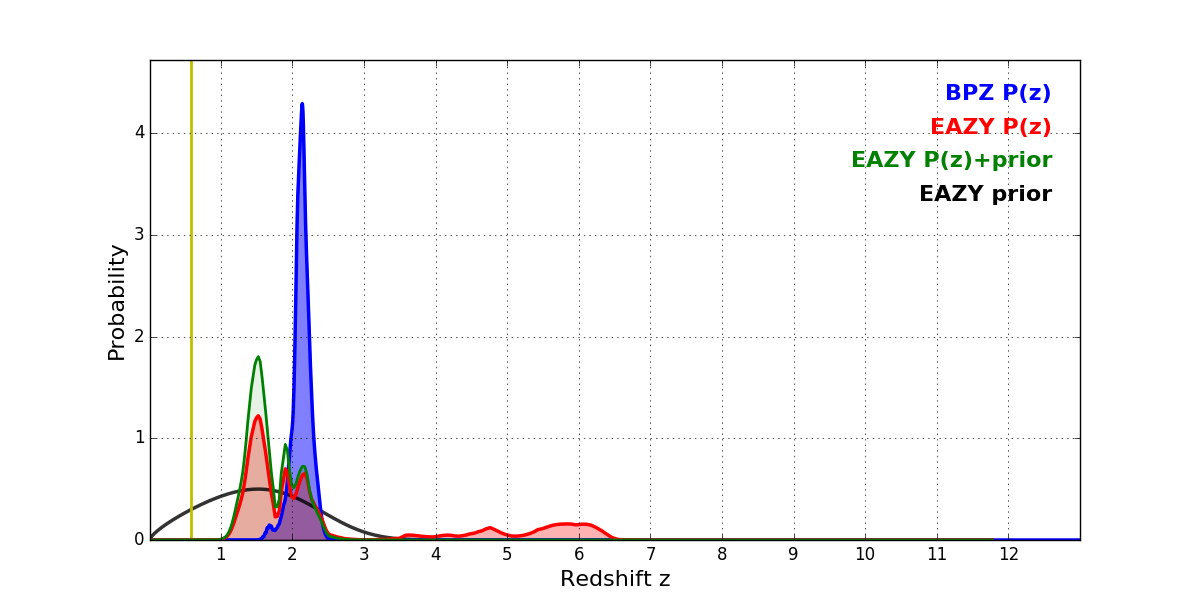 In P(z) plots: Yellow lines mark the cluster redshift z = 0.586,