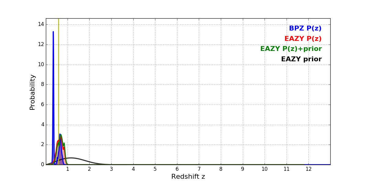 In P(z) plots: Yellow lines mark the cluster redshift z = 0.586,