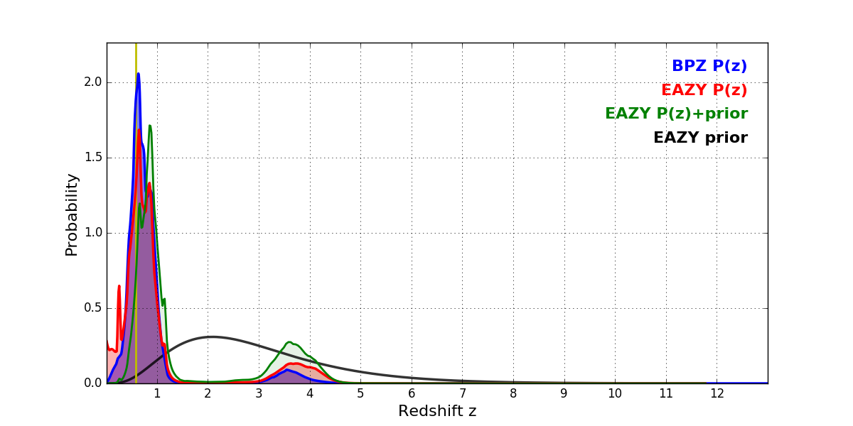In P(z) plots: Yellow lines mark the cluster redshift z = 0.586,