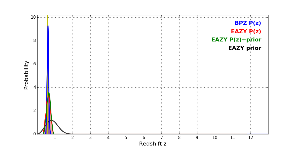 In P(z) plots: Yellow lines mark the cluster redshift z = 0.586,