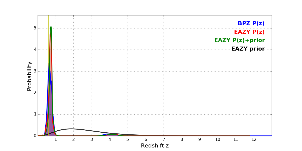 In P(z) plots: Yellow lines mark the cluster redshift z = 0.586,
