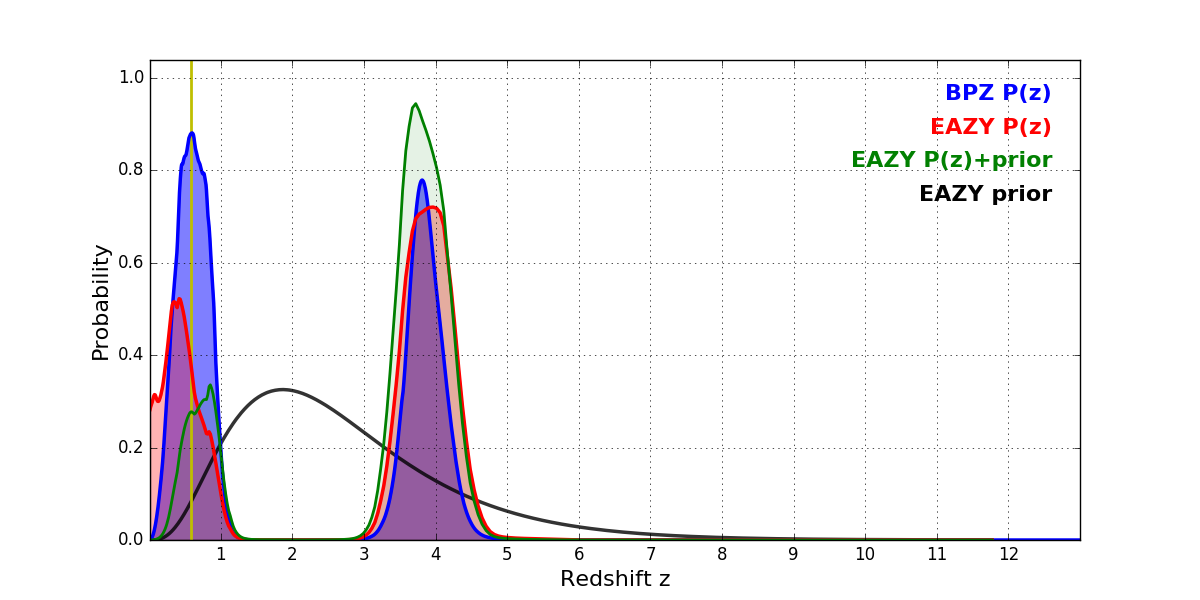 In P(z) plots: Yellow lines mark the cluster redshift z = 0.586,