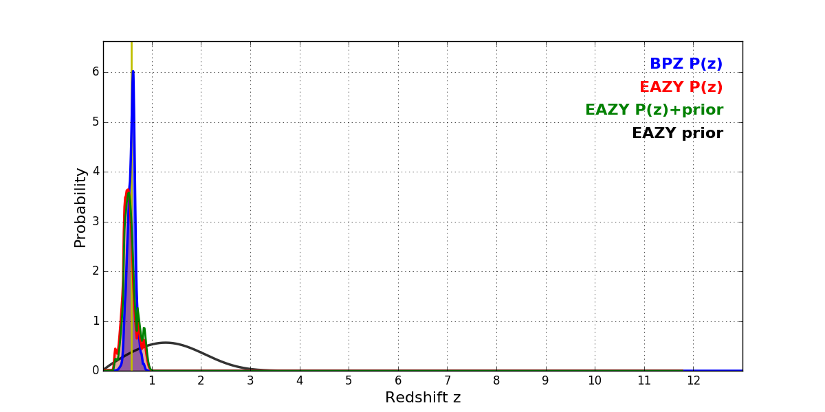 In P(z) plots: Yellow lines mark the cluster redshift z = 0.586,