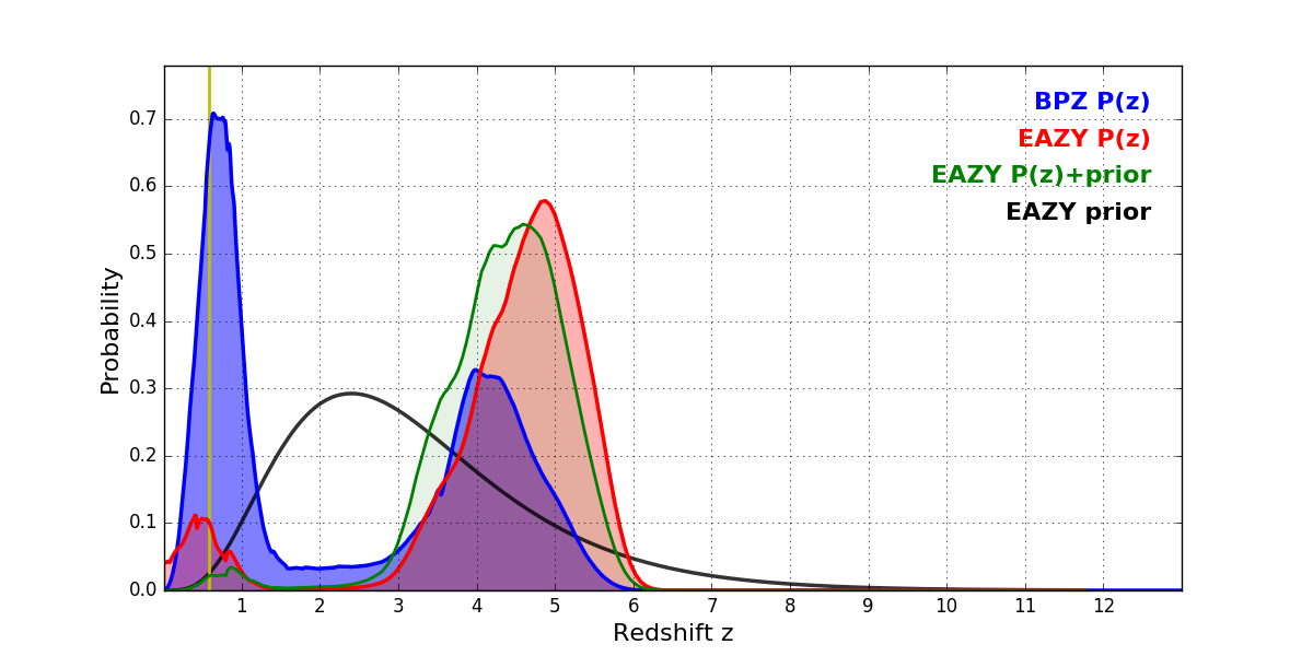 In P(z) plots: Yellow lines mark the cluster redshift z = 0.586,