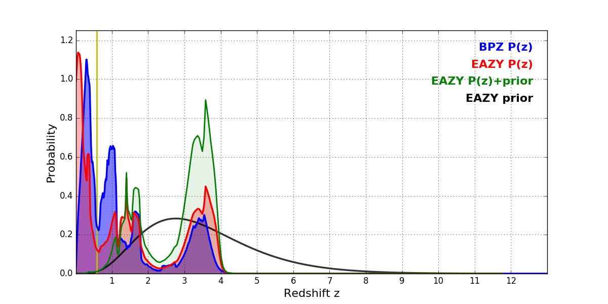 In P(z) plots: Yellow lines mark the cluster redshift z = 0.586,