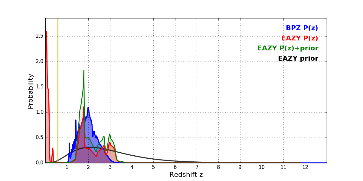 In P(z) plots: Yellow lines mark the cluster redshift z = 0.586,