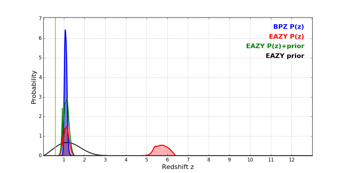 In P(z) plots: Yellow lines mark the cluster redshift z = 0.586,