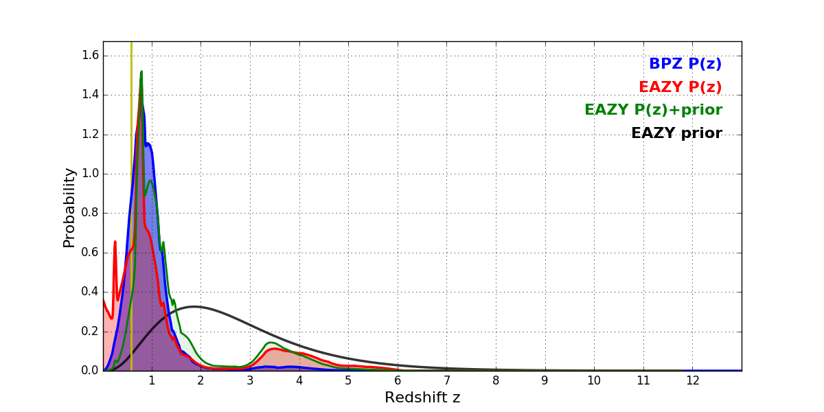 In P(z) plots: Yellow lines mark the cluster redshift z = 0.586,