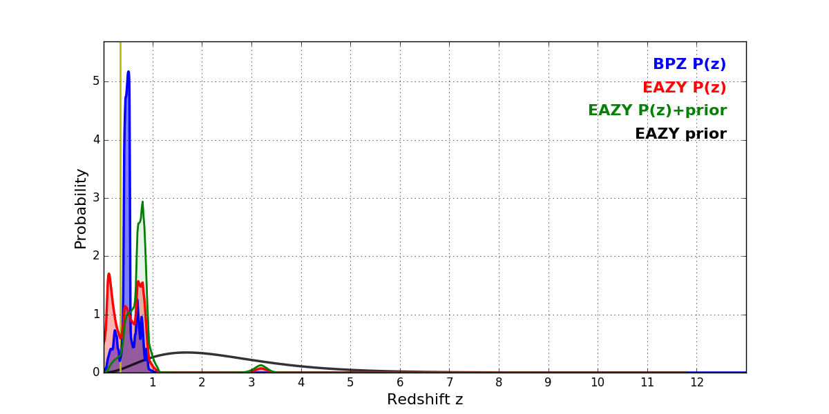 In P(z) plots: Yellow lines mark the cluster redshift z = 0.352,