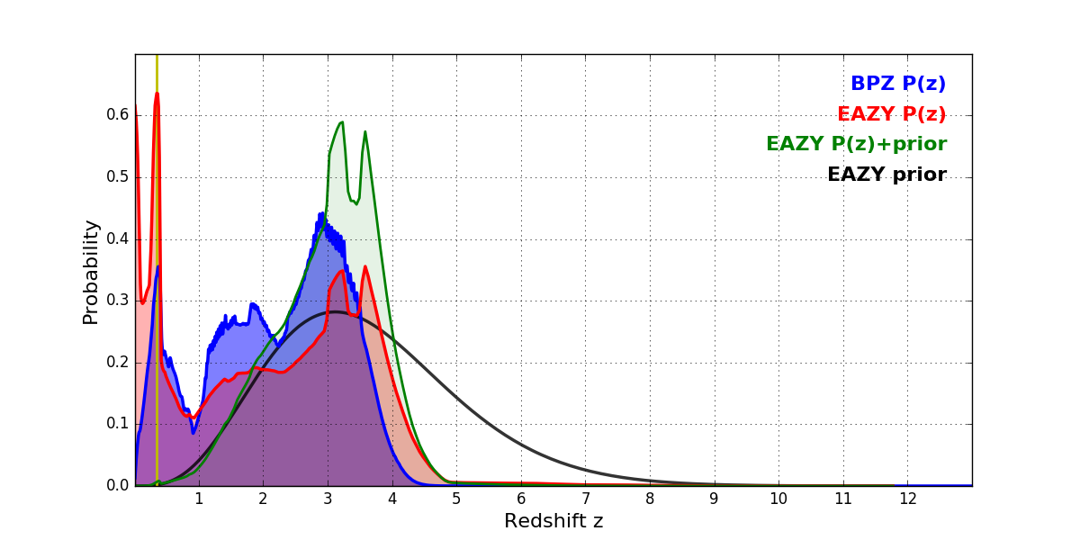 In P(z) plots: Yellow lines mark the cluster redshift z = 0.352,