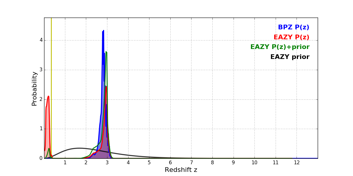 In P(z) plots: Yellow lines mark the cluster redshift z = 0.352,