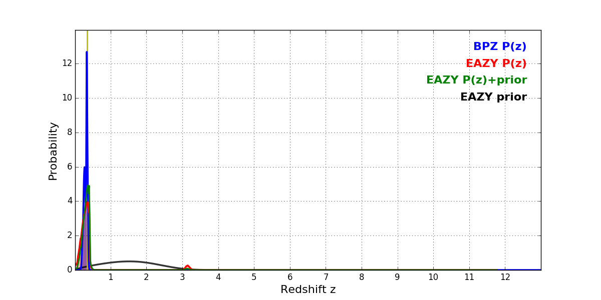 In P(z) plots: Yellow lines mark the cluster redshift z = 0.352,