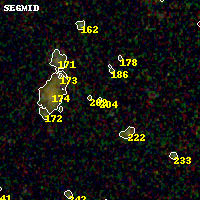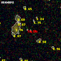 Object #204   x,y = (2491, 2215)   RA, Dec = (02:00:09.840, -8:49:18.84) = (30.04100, -8.82190)   BPZ = 0.769 [0.228--4.840]   type = 10.20 (SB3_B10 - SB11_A_0_l)   stellarity = 0.11   chisq2 = 1.25   ODDS = 0.08   z_cluster = 0.405