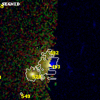 Object #492   x,y = (2610, 1588)   RA, Dec = (02:00:09.360, -8:49:56.28) = (30.03900, -8.83230)   BPZ = 0.403 [0.051--0.865]   type = 6.20 (Sbc_B10 - Scd_B10)   stellarity = 0.82   chisq2 = 990.00   ODDS = 0.21   z_cluster = 0.405