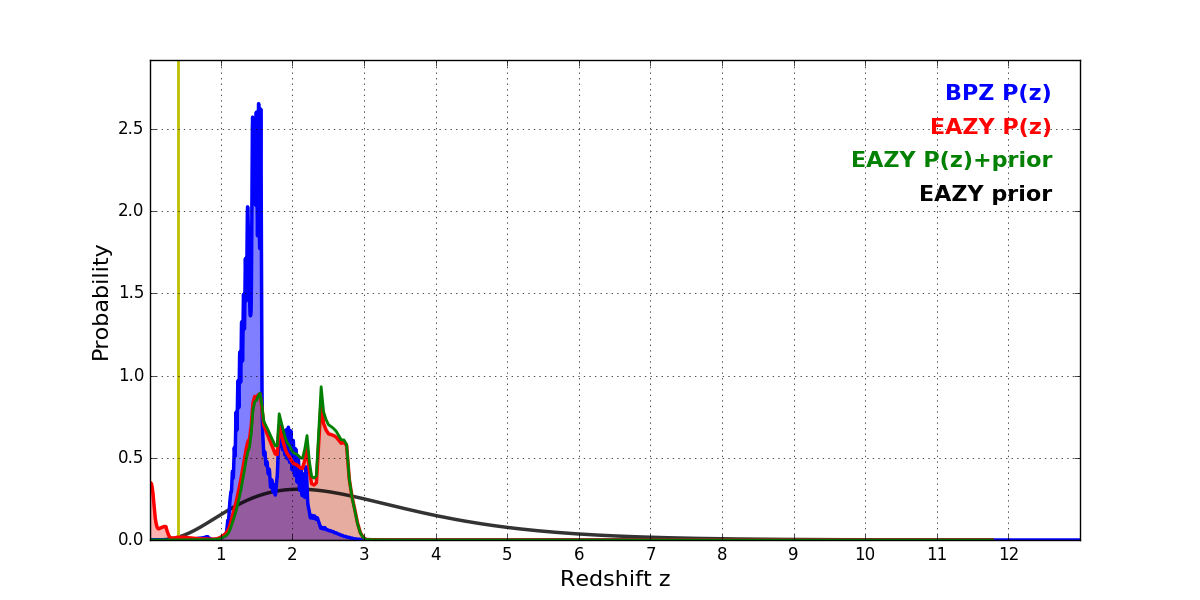 In P(z) plots: Yellow lines mark the cluster redshift z = 0.405,