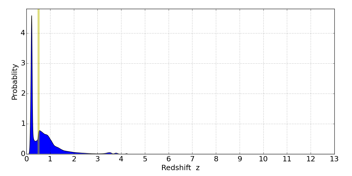 In P(z) plots: Yellow lines mark the cluster redshift z = 0.505,