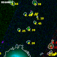 Object #1263 x,y = (2038, 4035) RA, Dec = (02:57:13.392, -23:24:54.72) = (44.30580, -23.41520) BPZ = 5.387 [5.067--8.088] type = 6.00 (Sbc_B10) chisq2 = 0.00 ODDS = 0.38 z_cluster = 0.505