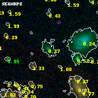 Object #1910 x,y = (3423, 3578) RA, Dec = (02:57:07.368, -23:25:22.08) = (44.28070, -23.42280) BPZ = 0.269 [0.224--3.616] type = 2.90 (Ell5_A_0 - Ell6_A_0) chisq2 = 0.00 ODDS = 0.29 z_cluster = 0.505
