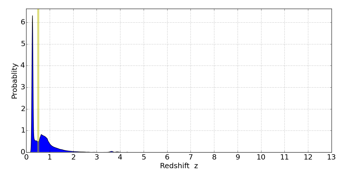 In P(z) plots: Yellow lines mark the cluster redshift z = 0.505,