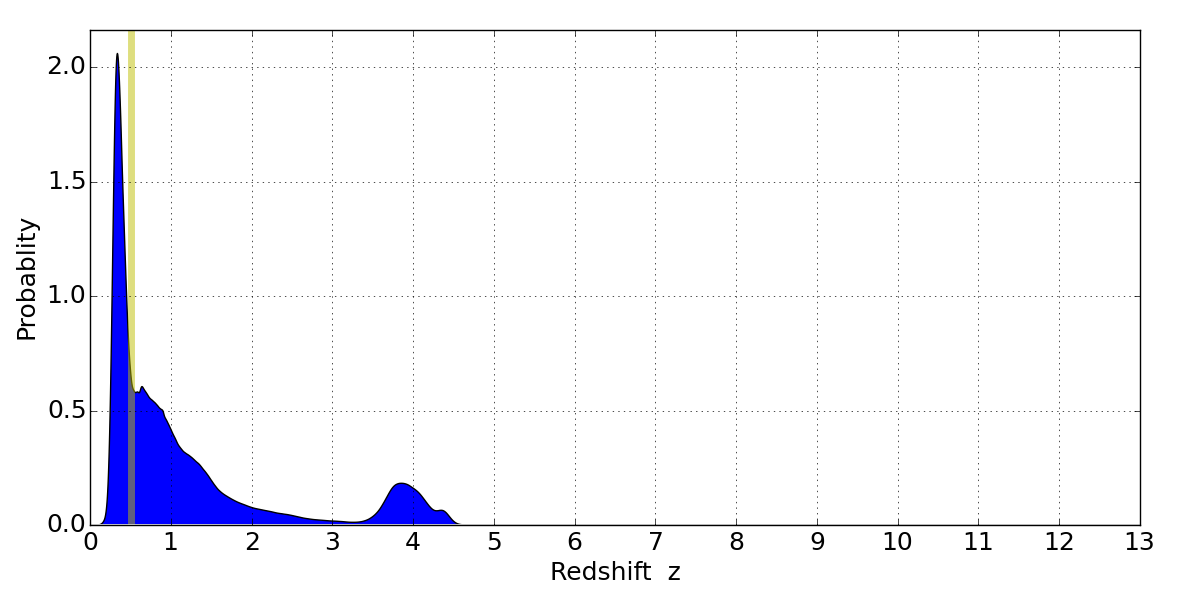 In P(z) plots: Yellow lines mark the cluster redshift z = 0.505,