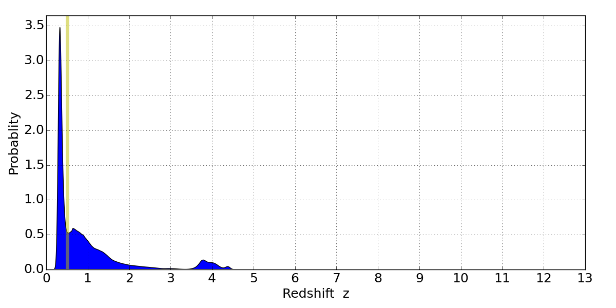 In P(z) plots: Yellow lines mark the cluster redshift z = 0.505,
