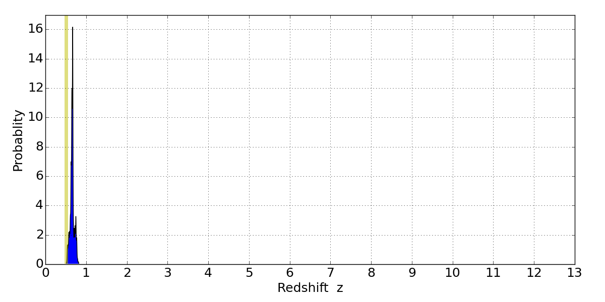 In P(z) plots: Yellow lines mark the cluster redshift z = 0.505,