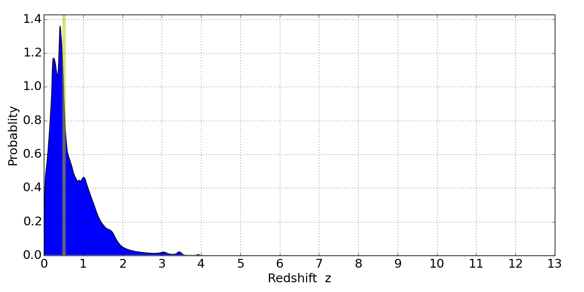 In P(z) plots: Yellow lines mark the cluster redshift z = 0.505,