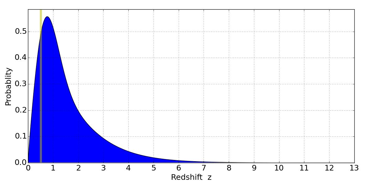In P(z) plots: Yellow lines mark the cluster redshift z = 0.505,
