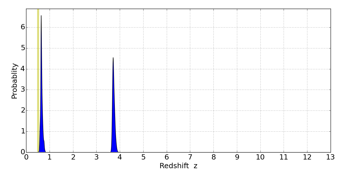 In P(z) plots: Yellow lines mark the cluster redshift z = 0.505,