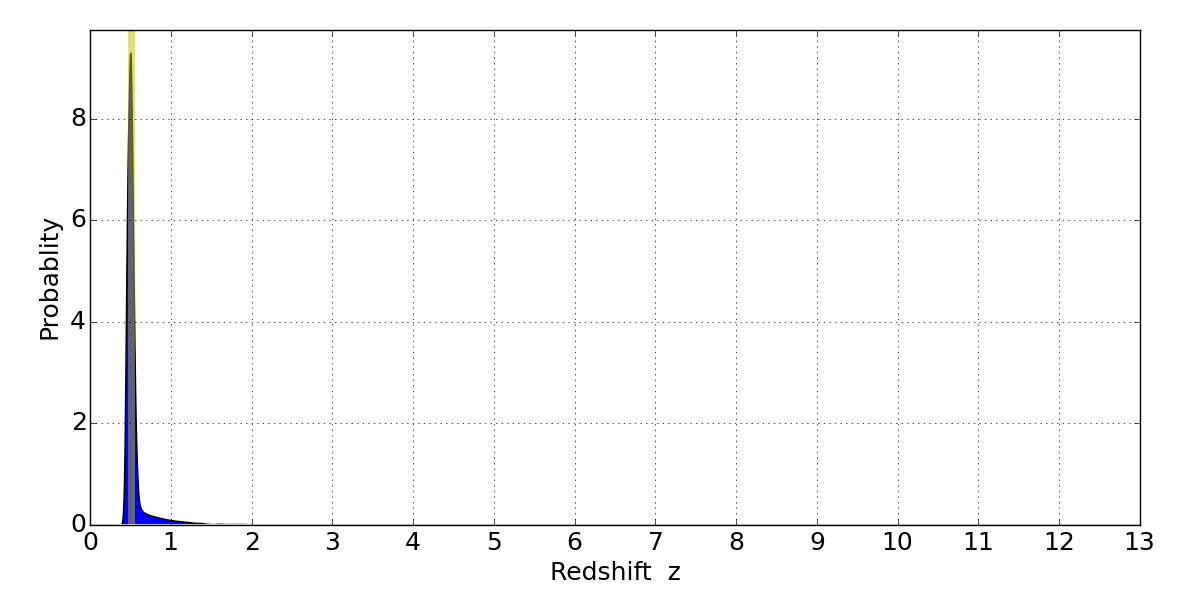 In P(z) plots: Yellow lines mark the cluster redshift z = 0.505,