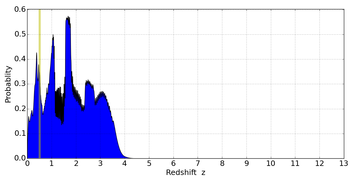 In P(z) plots: Yellow lines mark the cluster redshift z = 0.505,