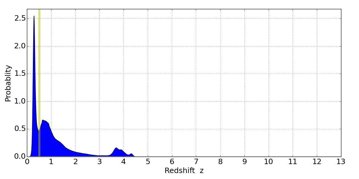 In P(z) plots: Yellow lines mark the cluster redshift z = 0.505,
