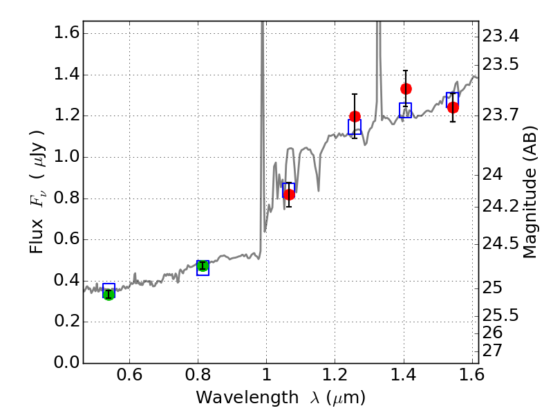 Object #4954 x,y = (3501, 1734) RA, Dec = (02:57:07.008, -23:27:12.60) = (44.27920, -23.45350) BPZ = 1.647 [1.401--1.772] type = 8.50 (SB2_B10 - SB1_B10) chisq2 = 0.22 ODDS = 0.73 z_cluster = 0.505