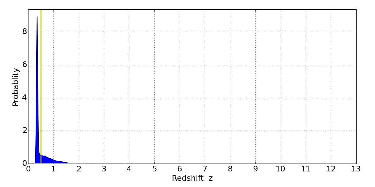 In P(z) plots: Yellow lines mark the cluster redshift z = 0.505,