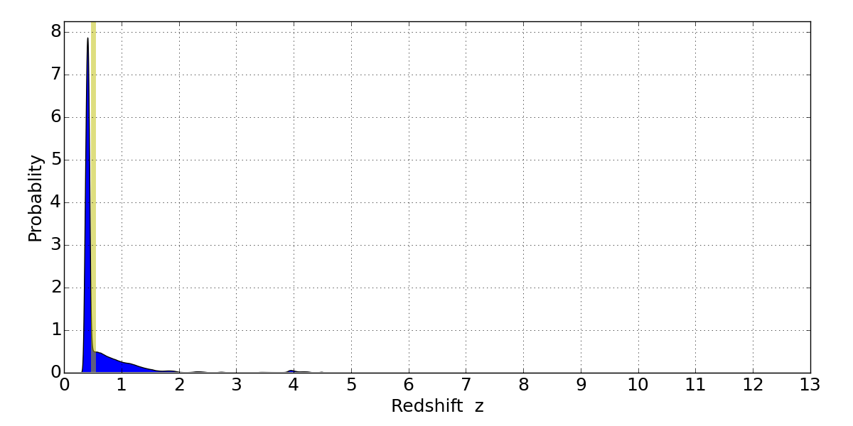 In P(z) plots: Yellow lines mark the cluster redshift z = 0.505,