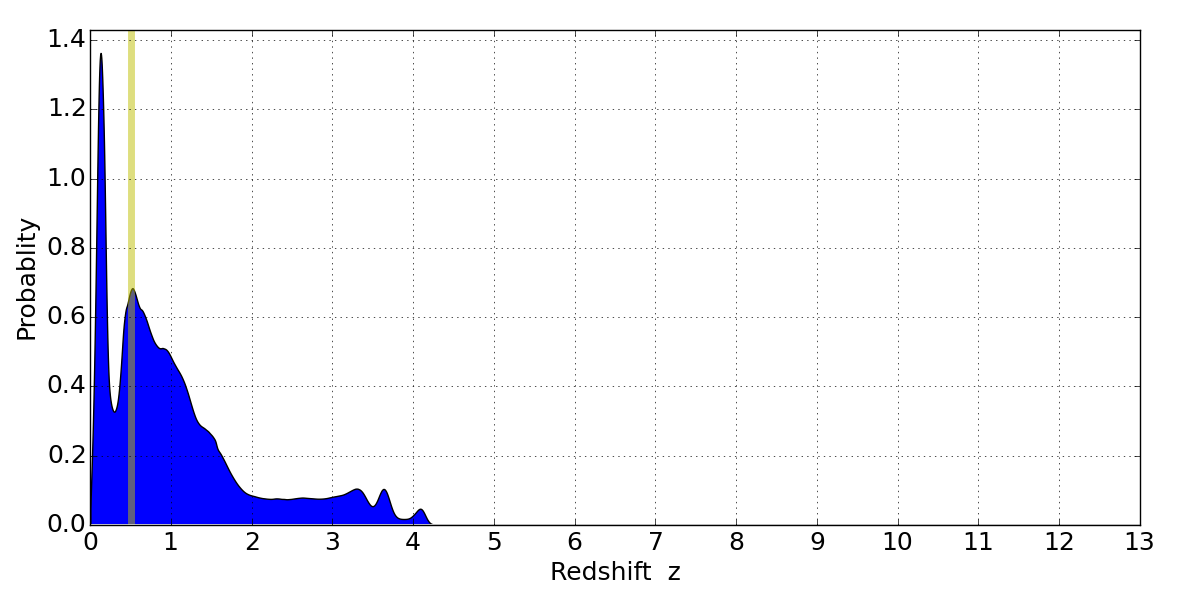 In P(z) plots: Yellow lines mark the cluster redshift z = 0.505,