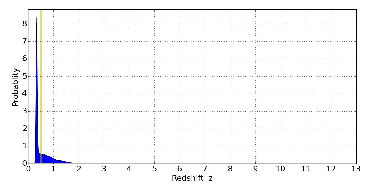 In P(z) plots: Yellow lines mark the cluster redshift z = 0.505,