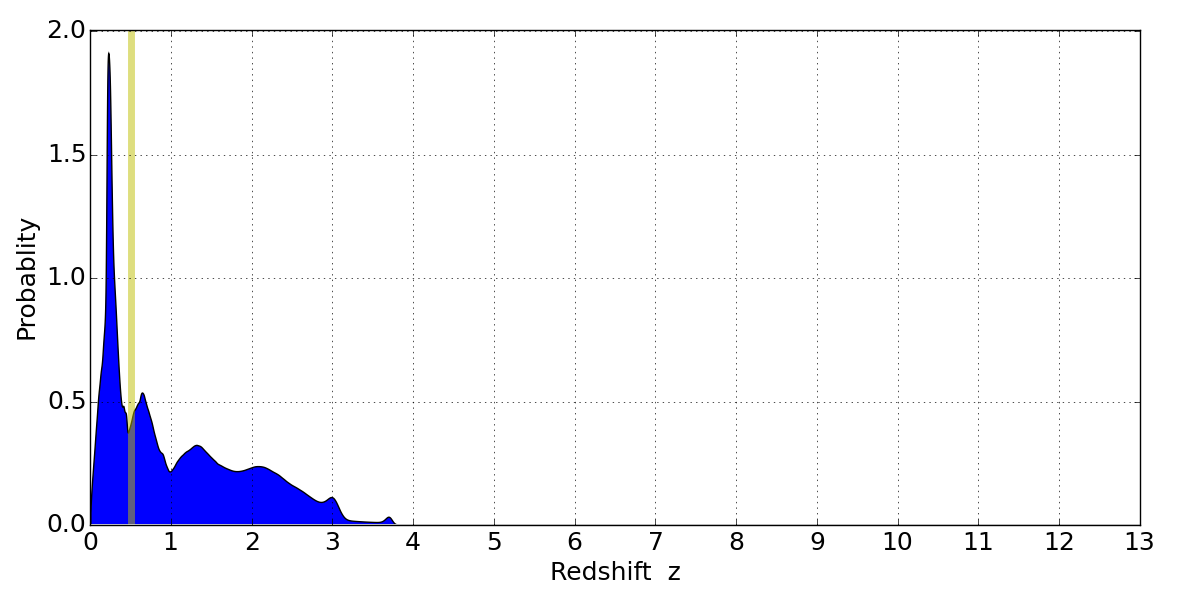 In P(z) plots: Yellow lines mark the cluster redshift z = 0.505,
